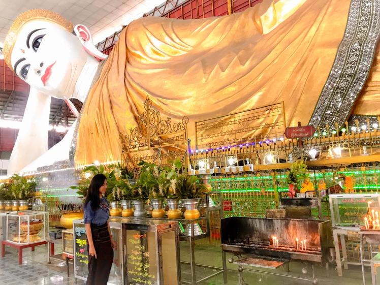 Fresh off the plane, I was whisked away to one of Yangon’s must-see landmarks, the Chaukhtatgyi Buddha Temple. Home to the colossal Reclining Buddha, this sacred site left me in awe. At 65 meters long, the Buddha stretches majestically across the temple, with intricate details and a peaceful ambiance that fills the space.